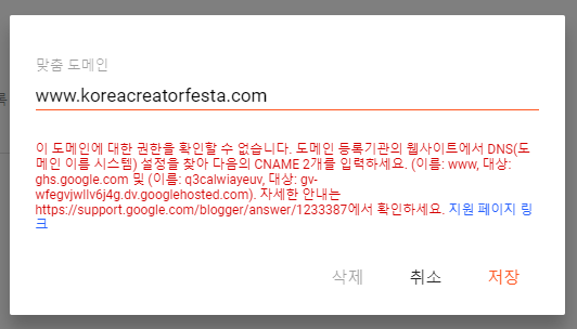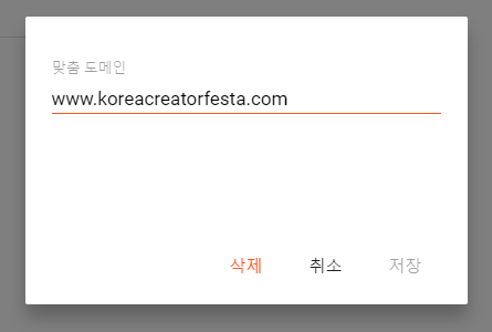 팝업 창에 연결하고자 하는 도메인을 입력하고 '저장'을 누르면 첫 단계 완료!