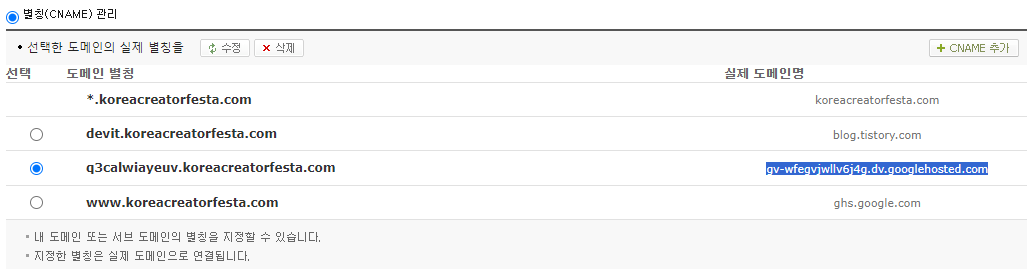 - 하나를 더 추가하여 하위도메인 이름은 'q3calwiayeuv'로 하고 'gv-wfegvjwllv6j4g.dv.googlehosted.com' 을 입력합니다.