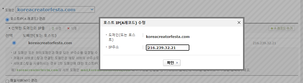카페24는 '@'와 같은 특수문자를 입력할 수도 없고, 아이피는 하나밖에 못쓰기 때문에 1개만 A레코드로 연결해주었습니다.