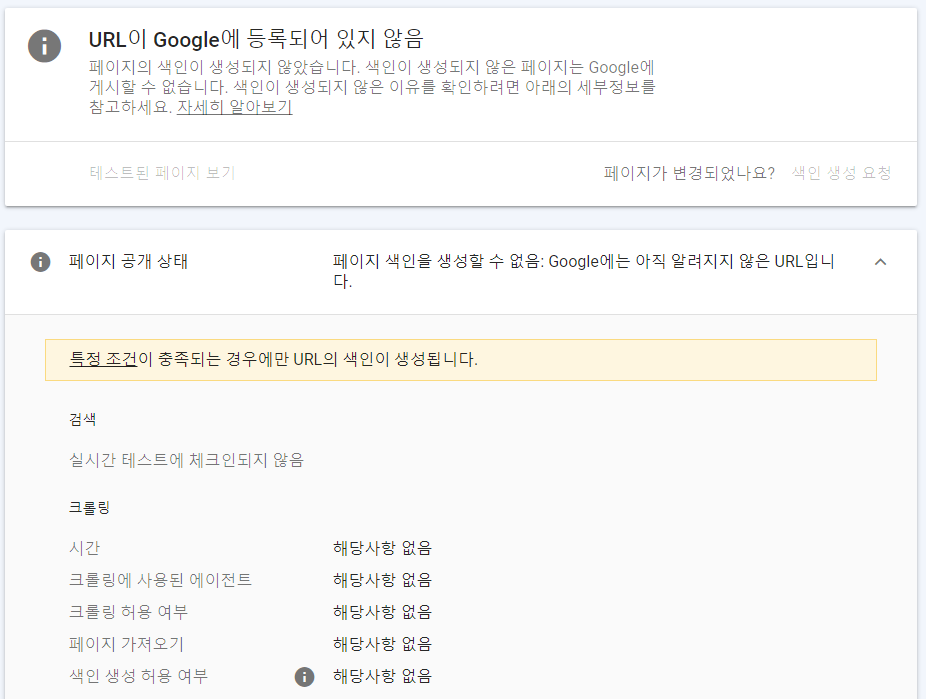 저는 글을 작성하고 구글서치콘솔에서 수동으로 글을 등록합니다. 사이트맵을 등록하면 자동으로 되지만 오래걸리거든요. 그래서 조금이라도 더 빨리 검색에 등록이 되라고 수동으로 넣어주고 있습니다. 그런데 "특정 조건이 충족되는 경우에만 URL의 색인이 생성됩니다." 라는 경고가 떴습니다.