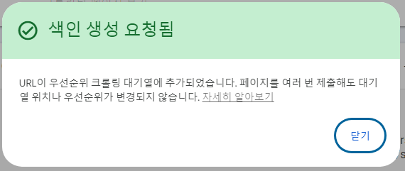 그렇게 몇번을 시도하고, 얼마의 시간이 지난 다음 다시 시도를 계속 하다보니 결국 색인 생성 요청에 성공하였습니다.