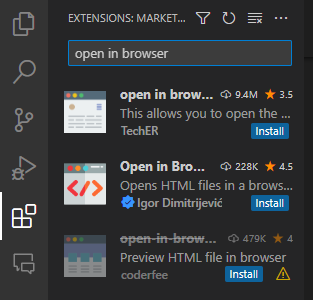 "Open in Browser"을 검색창에 입력하고 검색 결과 중 해당 확장 기능을 찾아 설치합니다.