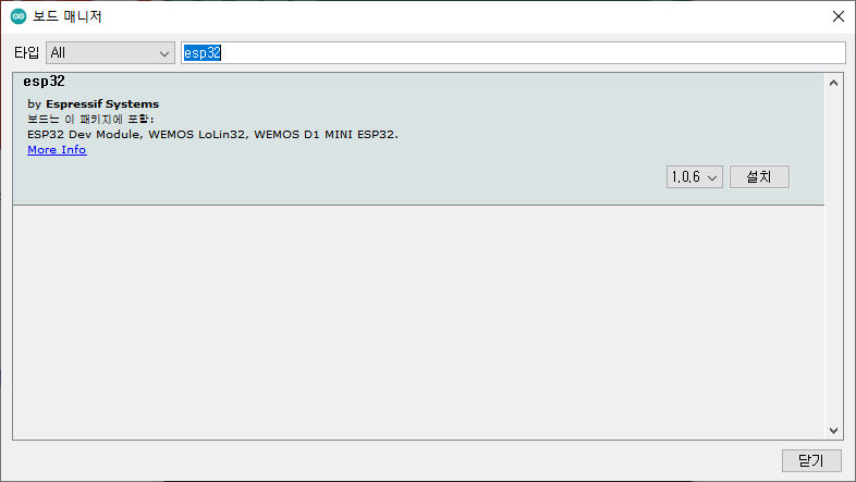 보드 매니저에서 'ESP32'를 검색하고 관련된 파일들을 설치합니다.