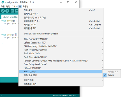 마지막으로 ESP32 보드가 컴퓨터에 올바르게 연결되었는지 확인하고, 적절한 COM 포트를 설정합니다.