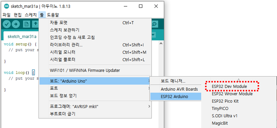 ESP32 보드를 아두이노 IDE와 함께 사용하기 위한 설정을 진행합니다.