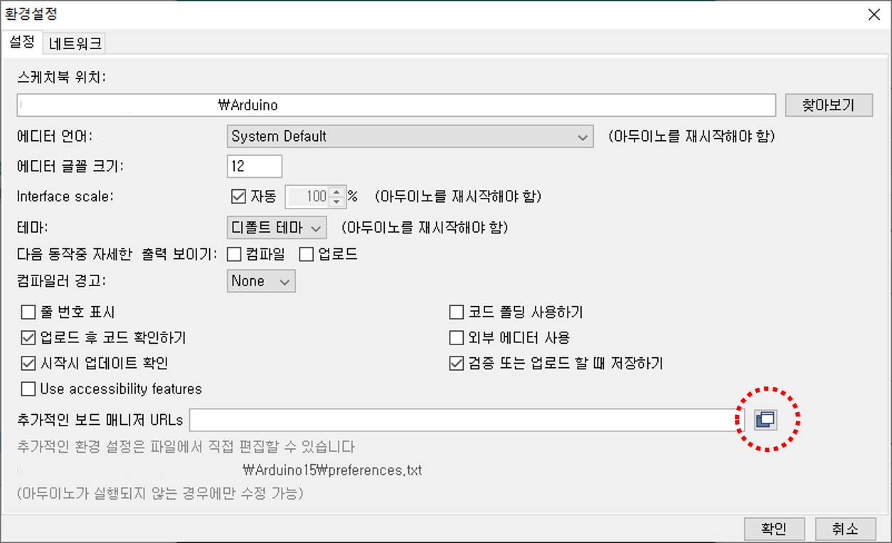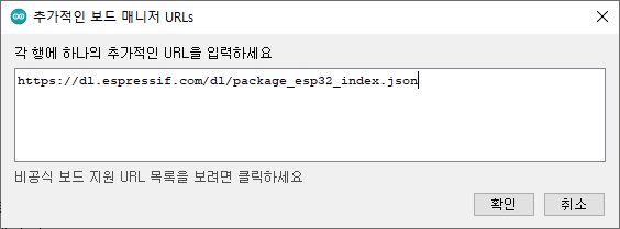 '추가적인 보드 매니저 URLs'에 다음 주소를 입력합니다