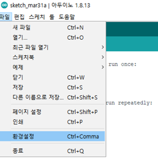 아두이노 IDE를 열고, '파일' > '환경설정'으로 이동합니다.