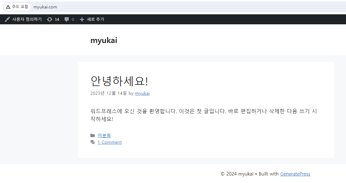 이렇게 카페24의 워드프레스블로그 서비스를 이용해서 새로운 도메인과 블로그를 만들었습니다.