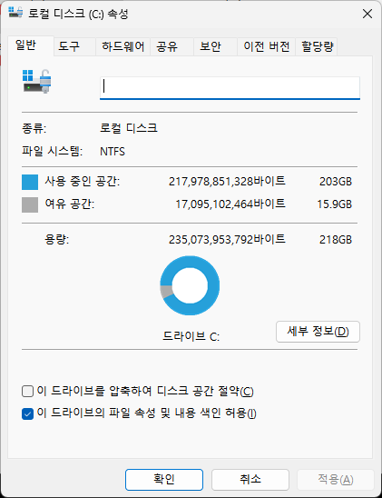 15기가나 남았지만 빨간색이라 표시가 되어서 뭔가 불안해 보입니다. 옛날엔 512메가 이런 하드로 어떻게 살았는가 모르겠네요.