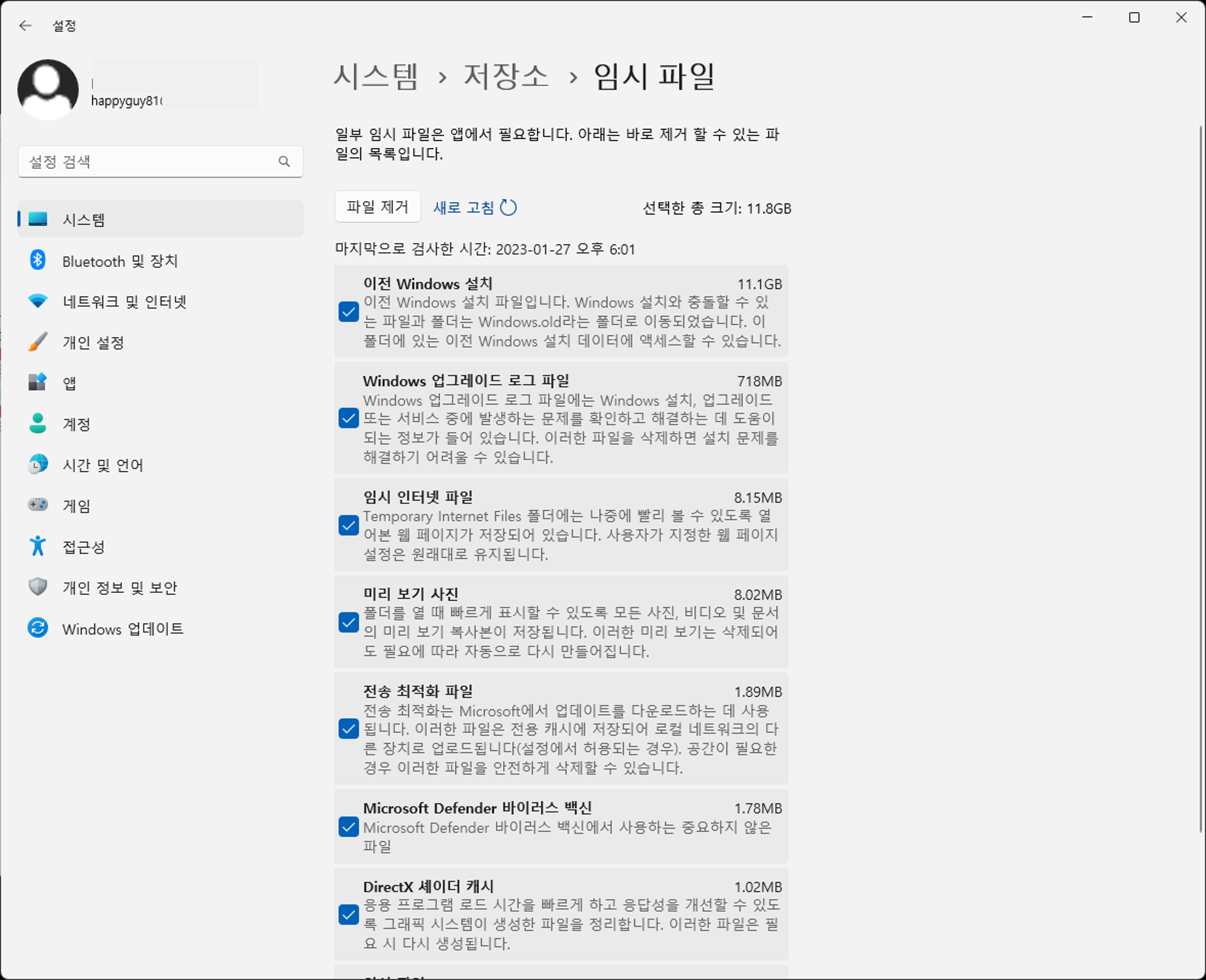 메뉴에서 확인 가능합니다. 이곳에서 불필요한 파일들을 선택하여 삭제하면 C드라이브의 용량을 늘릴 수 있습니다.