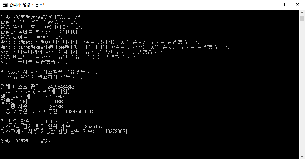 - 오류가 발생한 드라이브(예: d:)를 대상으로 CHKDSK d: /f 명령어를 실행합니다.