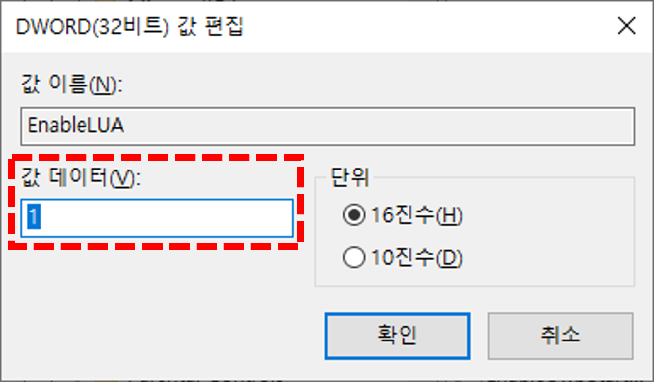 - 'EnableLUA' 항목을 더블 클릭하여 값 데이터를 '1'에서 '0'으로 변경 후, 확인을 클릭합니다.