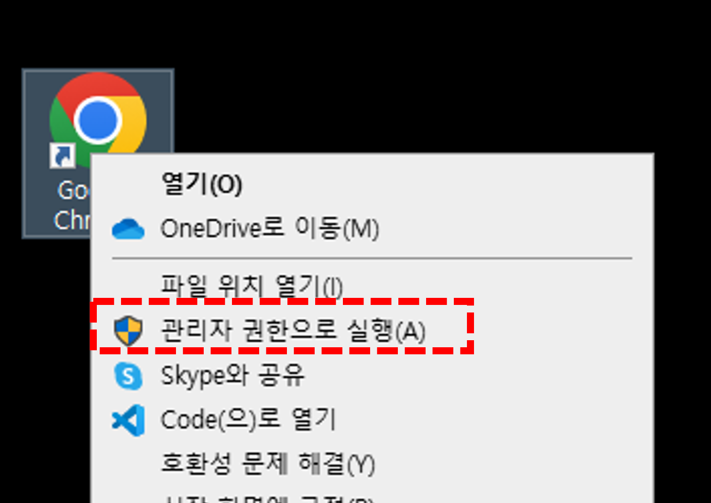 - '관리자 권한으로 실행(A)'을 선택합니다.