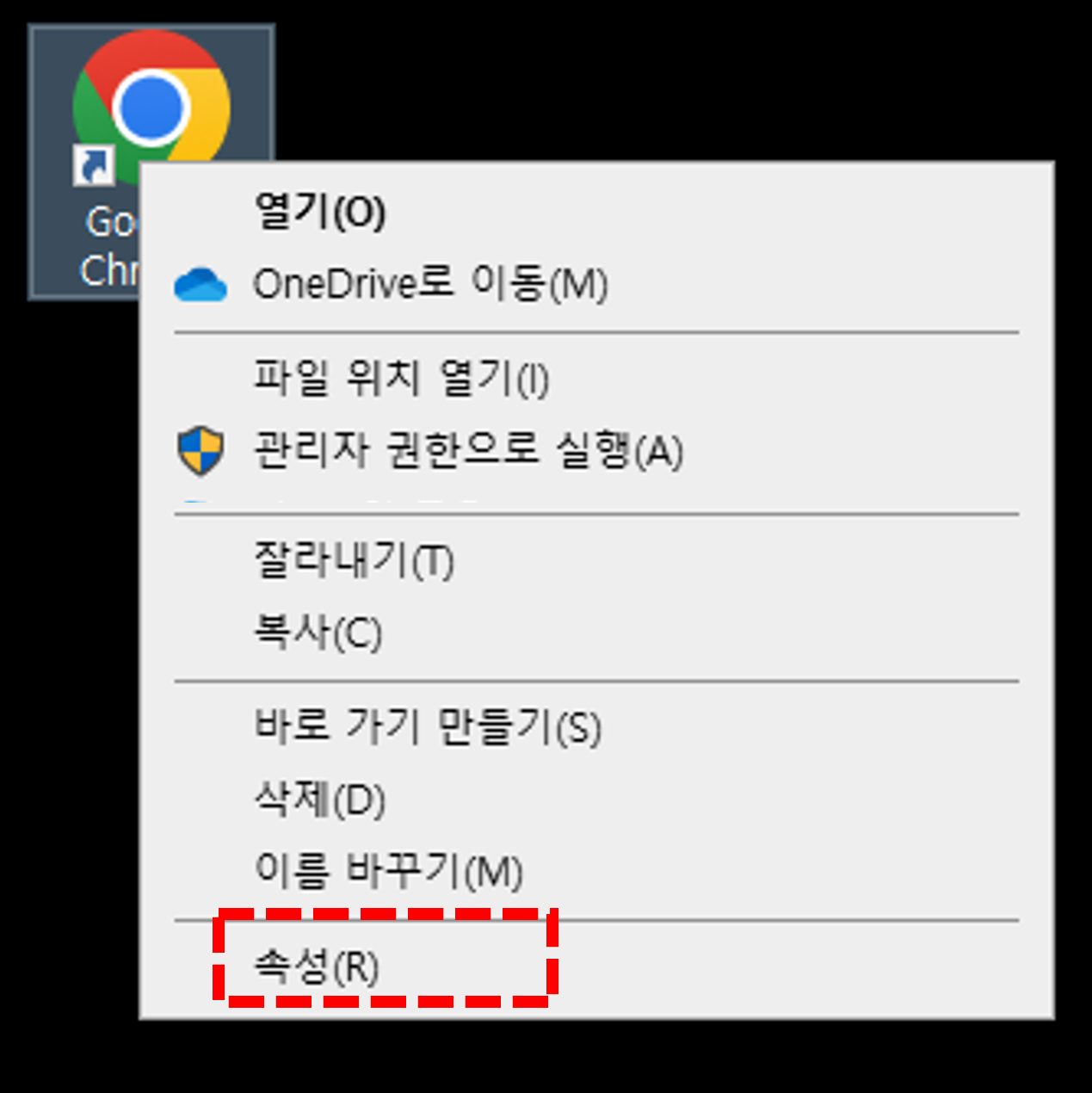 - 프로그램 아이콘 또는 파일을 마우스 우클릭하고 '속성(R)'을 선택합니다.