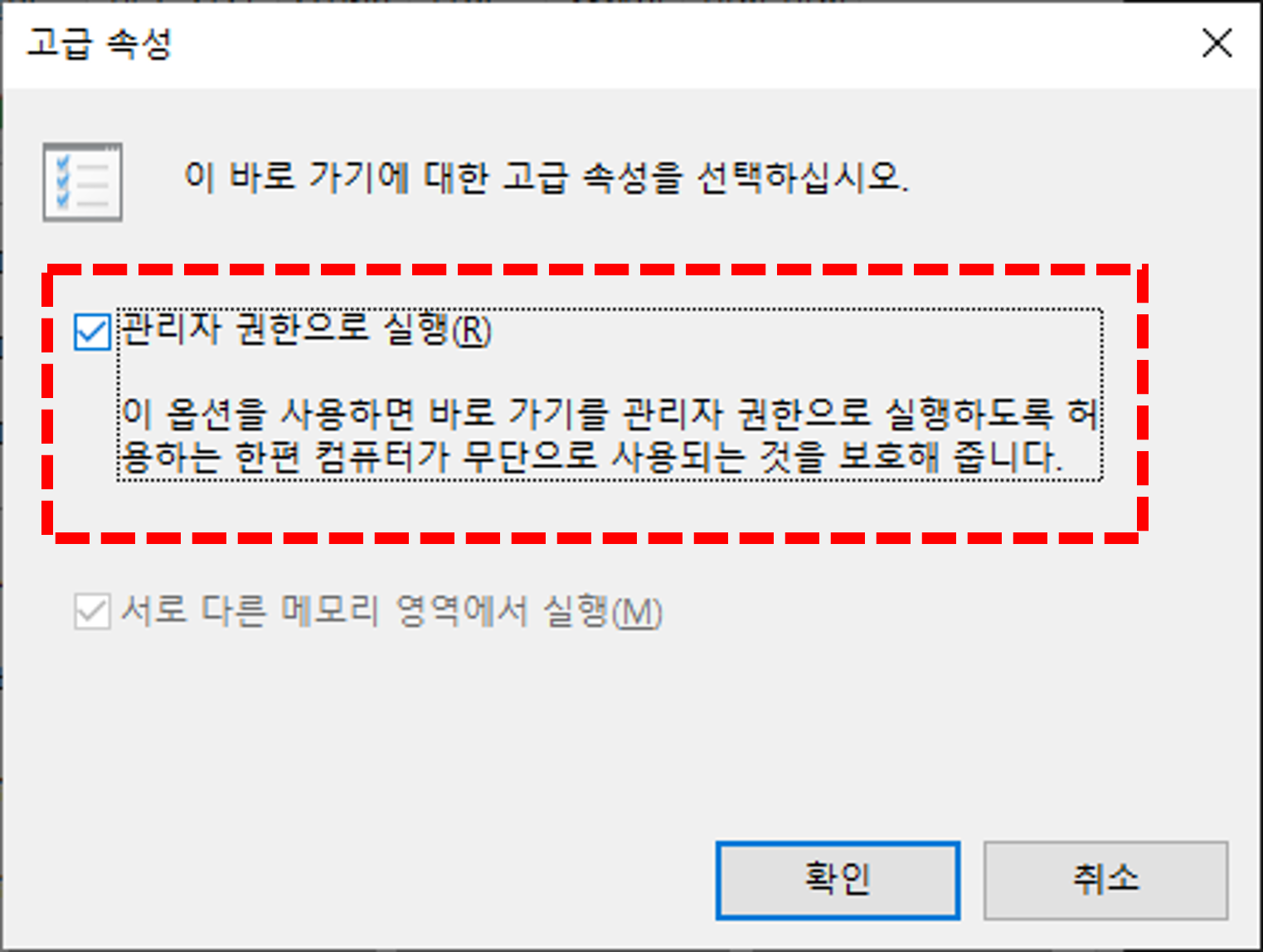 - '관리자 권한으로 실행' 옵션에 체크하고 '확인'을 클릭합니다.