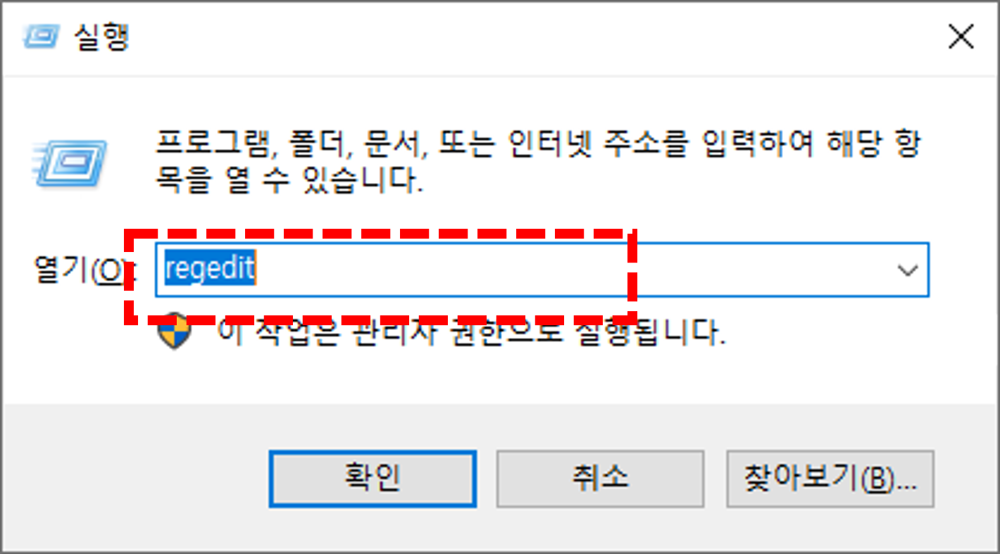 - 'regedit'를 입력하고 확인을 클릭합니다.