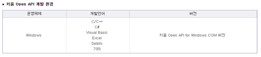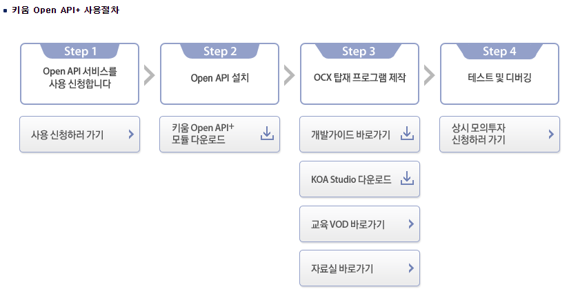프로젝트의 첫 걸음은 증권사 API에 접근하는 것부터 시작됩니다. 저는 키움증권의 OPENAPI를 선택했습니다. 키움증권 OPENAPI는 개발자들이 증권사의 주식 거래 시스템에 접근할 수 있게 해주는 툴이죠. 사용 방법은 다음과 같습니다: