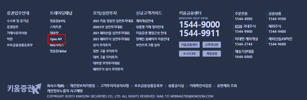 2. 페이지 하단의 '트레이딩채널' > 'OPENAPI' 항목으로 이동합니다.