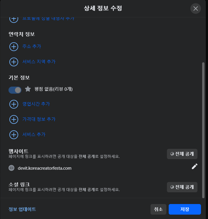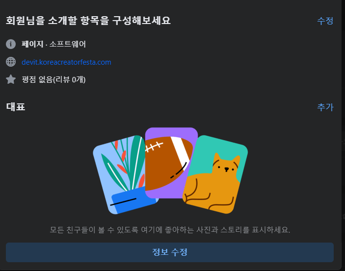 제 페이스북페이지니까 저는 당연히 저의 티스토리 블로그 주소(https://devit.koreacreatorfesta.com/)를 작성했답니다.