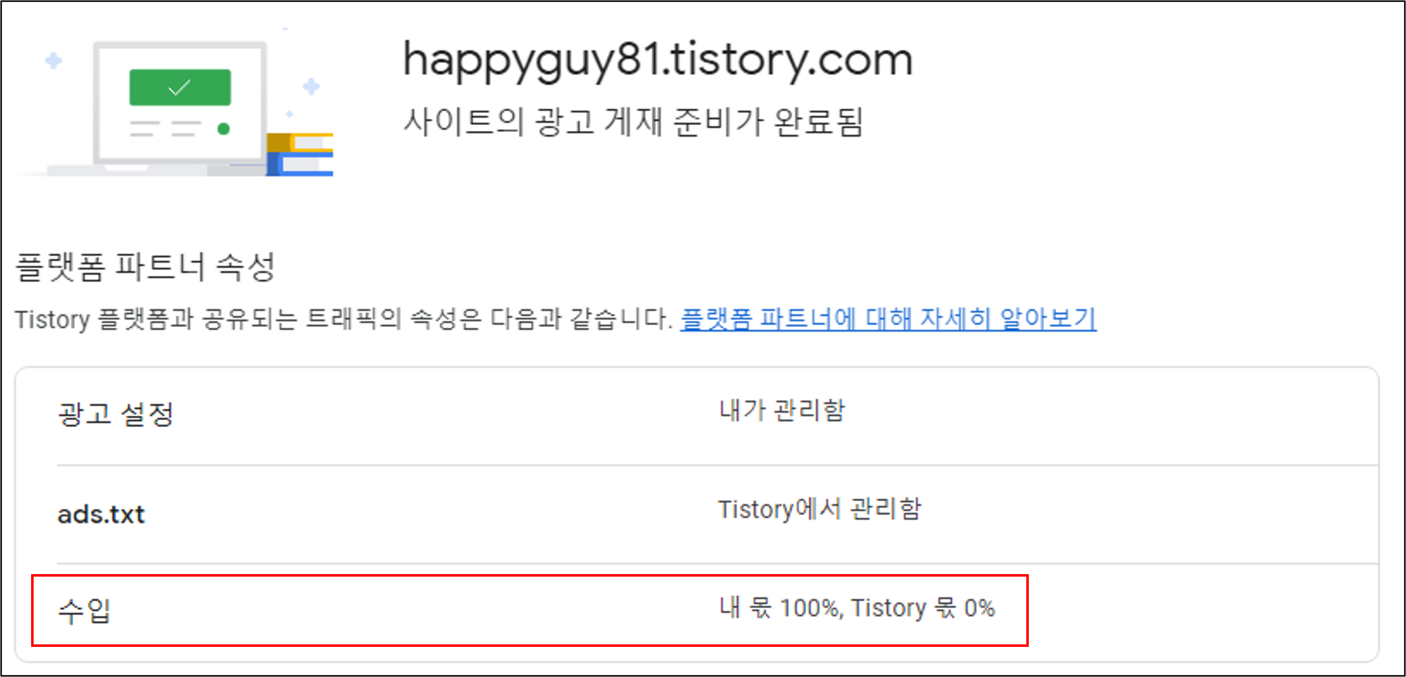 애드센스에 들어가 보면 수입 항목에 내 몫과 티스토리 몫이라는 항목이 나누어져서 보인다. 구글쪽과도 이미 어느 정도 이야기가 끝난 것 같다. 그러니 이렇게도 나오는 게 아닐까 싶기도 하다.