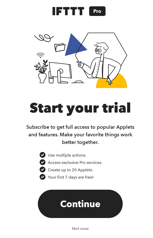 페이스북으로 가입을 하고 나면 가입이 성공되고 나서 IFTTT PRO를 가입할것이냐고 묻습니다.