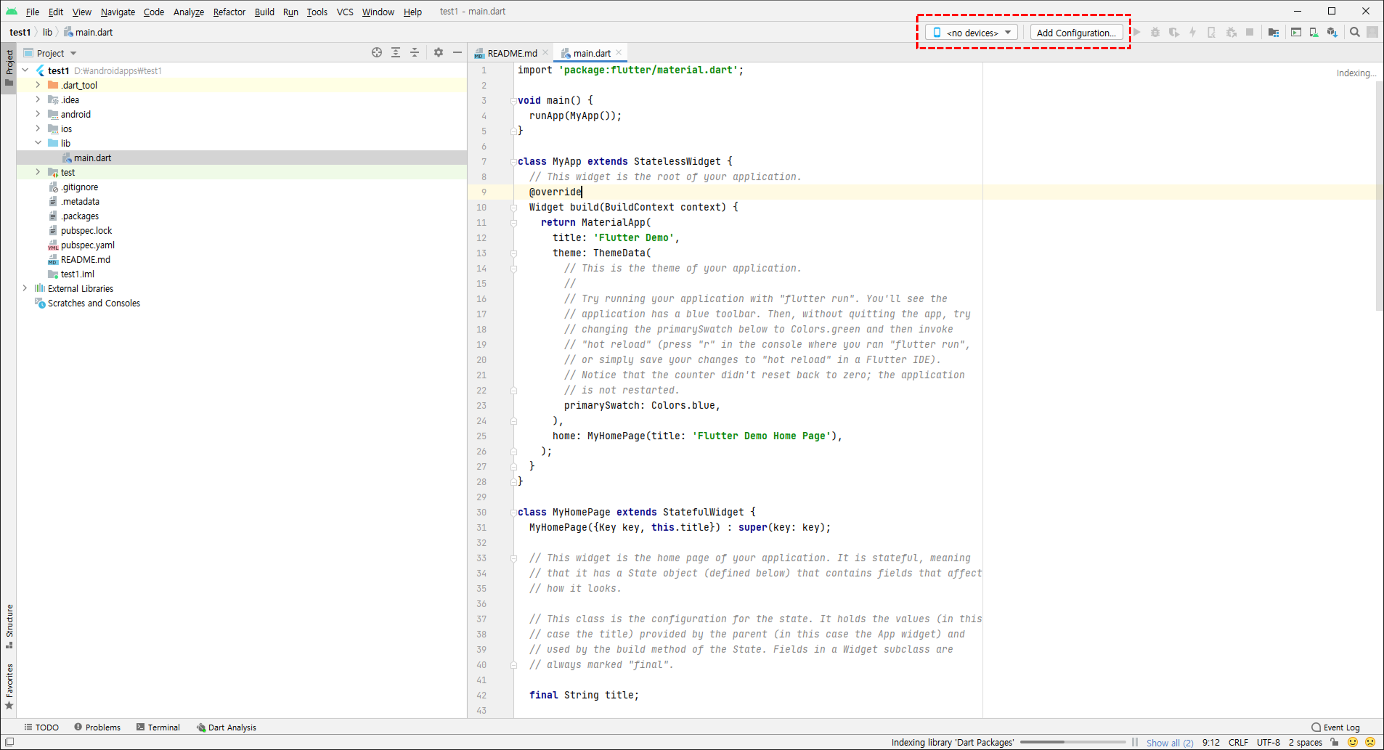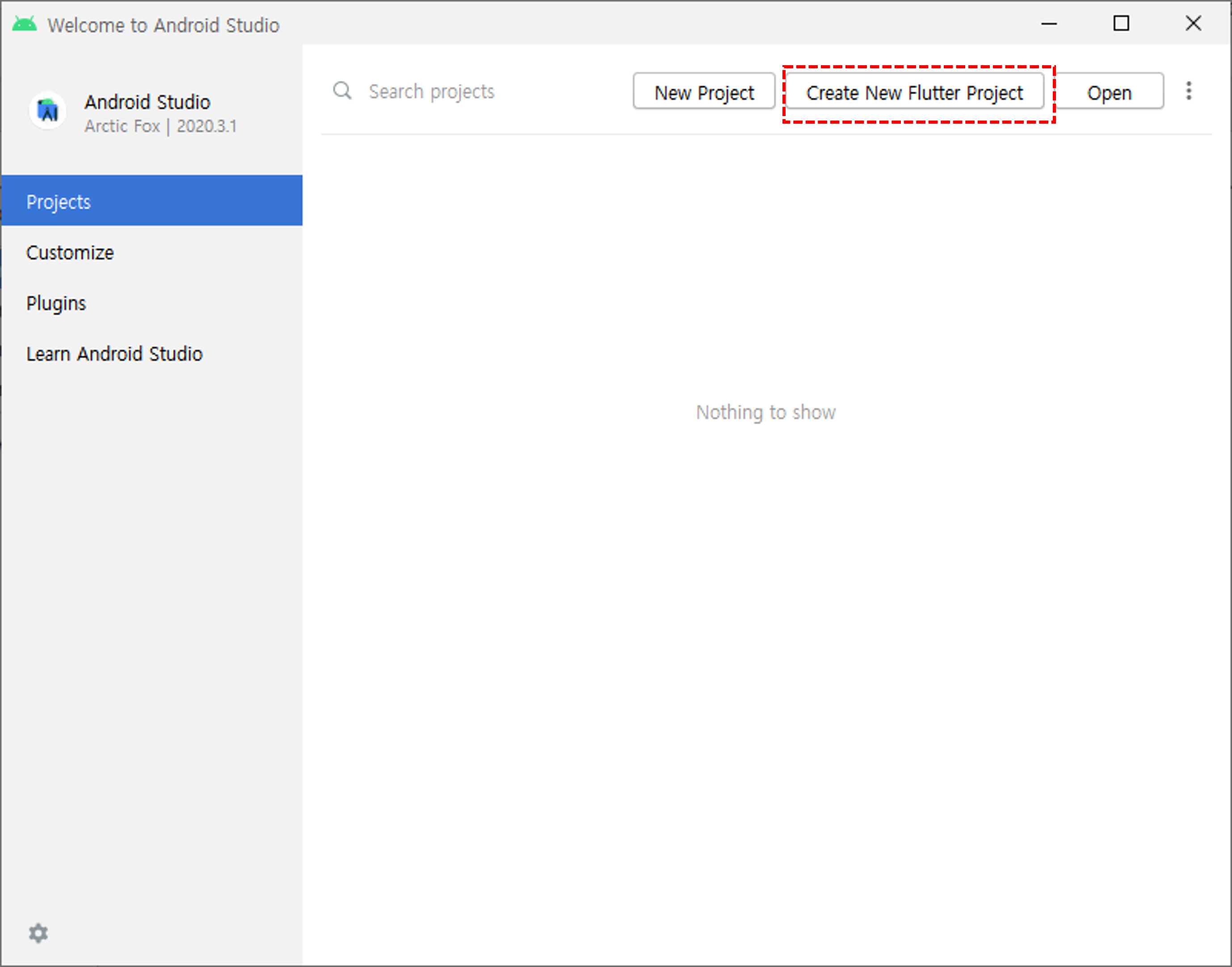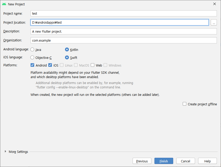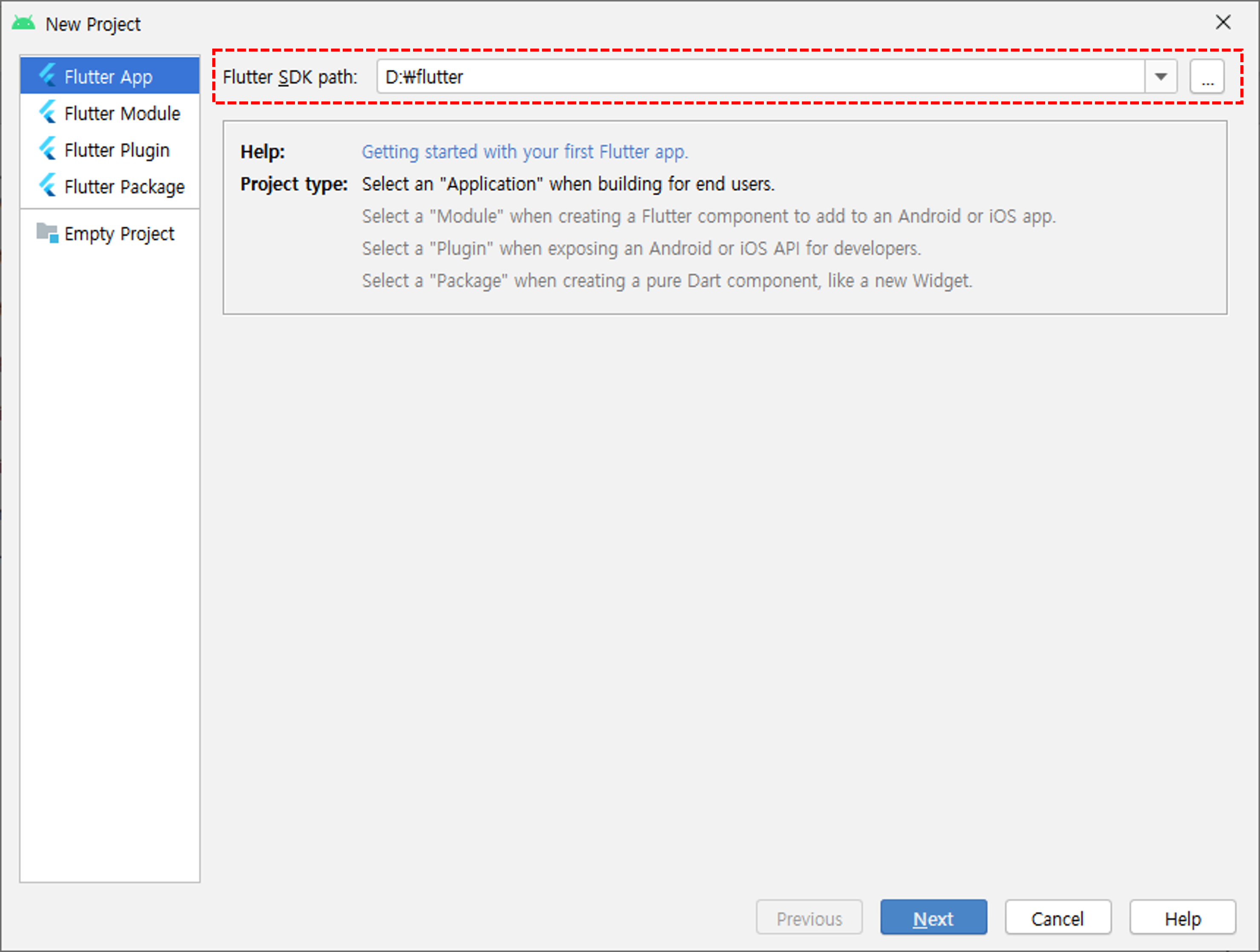 설치 후 재시작을 하면 create flutter project가 보이는데 플러터 프로젝트를 만드려면 이버튼을 클릭해서 만들고, flutter SDK path 는 아까 d:\flutter 폴더로 지정해둔 sdk의 경로를 설정해주면 된다. 나머지는 프로젝트를 그냥 만들면,