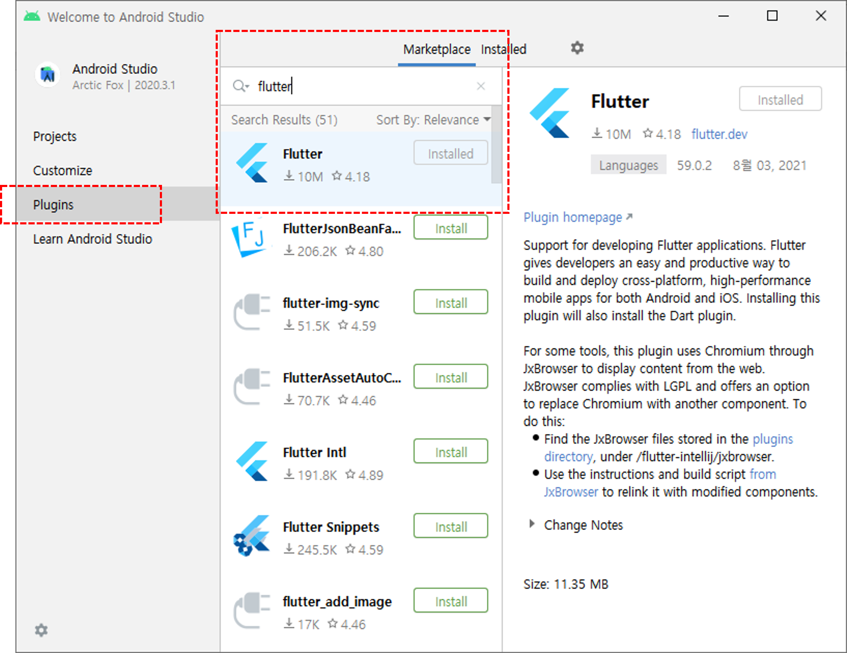 plugin > Marketplace > flutter 을 검색해주면 플러터가 보이는데 설치해주면 된다. 이때 dart도 같이 설치해줄까? 라고 뜨는데 네 하고 설치하면 된다.