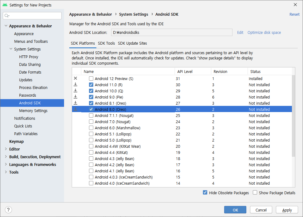 원하는 버전의 sdk를 체크하여 설치해둔다.