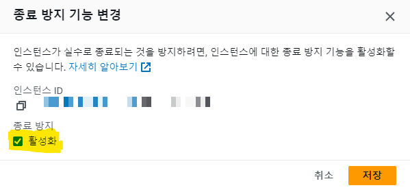 방지 설정이 제대로 적용되었는지 확인하려면, 인스턴스 세부 정보에서 '종료 방지' 항목이 '활성화됨'으로 표시되어 있는지 확인합니다.