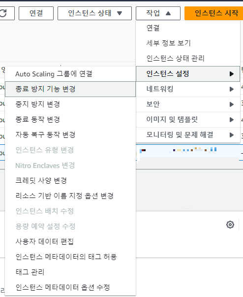 인스턴스를 선택했다면, 우측 상단에 "작업 > 인스턴스 설정 > 종료 방지 기능 변경"을 클릭합니다.