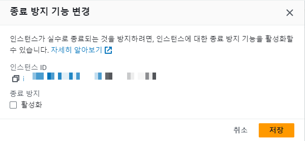 종료 방지 설정을 활성화하면 인스턴스를 실수로 종료하는 것을 방지할 수 있지만, 이 설정은 루트 또는 관리자의 권한으로 언제든지 변경될 수 있습니다.