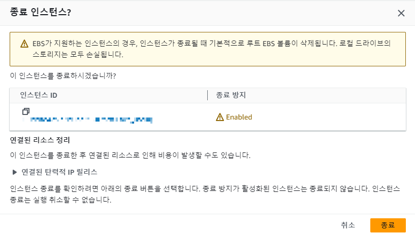 종료 방지가 활성화된 인스턴스는 종료되지 않습니다. 인스턴스 종료는 실행 취소할 수 없습니다.