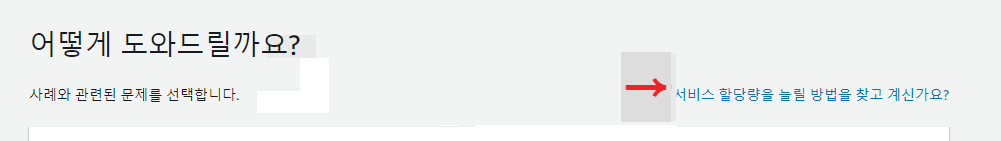 3. 어떻게 도와드릴까요? 에서 파란색 글자인 "서비스 할당량을 늘릴 방법을 찾고 계신가요?" 를 클릭합니다.