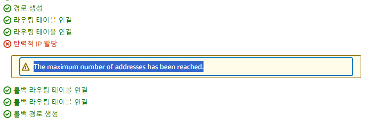 그러다보니 탄력적 IP(Elastic IP)가 한도 초과 상태인 경우, VPC 설정 중 새로운 Elastic IP를 할당할 수 없기 때문에 이 에러가 발생해버렸네요.