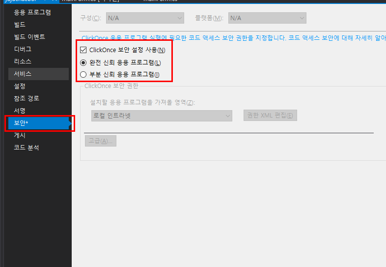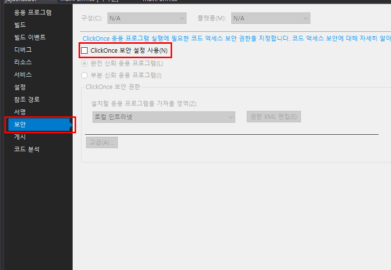 ClickOnce 보안설정 사용이 체크가 안되어 있는데 요거 체크해준다.