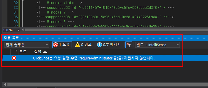 ClickOnce는 요청 실행수준 'requireAdministrator'을(를) 지원하지 않습니다.