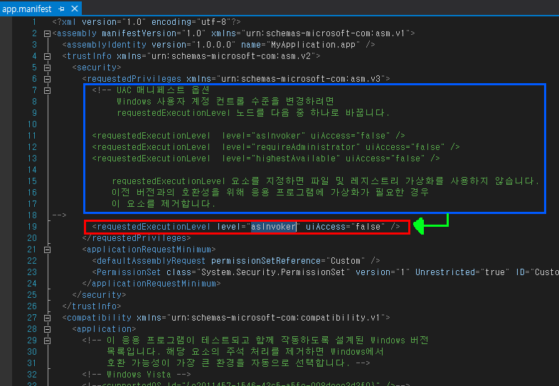 관리자를 요구해야 하기에 빨간박스 구간에 기본값인 level="asInvoker" 을 지우고 level="requireAdministrator" 로 수정해준다.