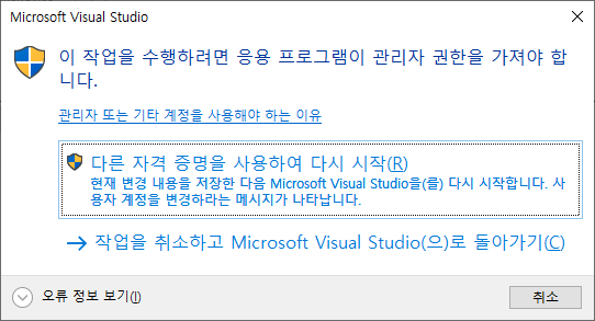 그럼 증명을 사용하여 다시 시작 -> 비주얼스튜디오가 종료되고 재실행된다.