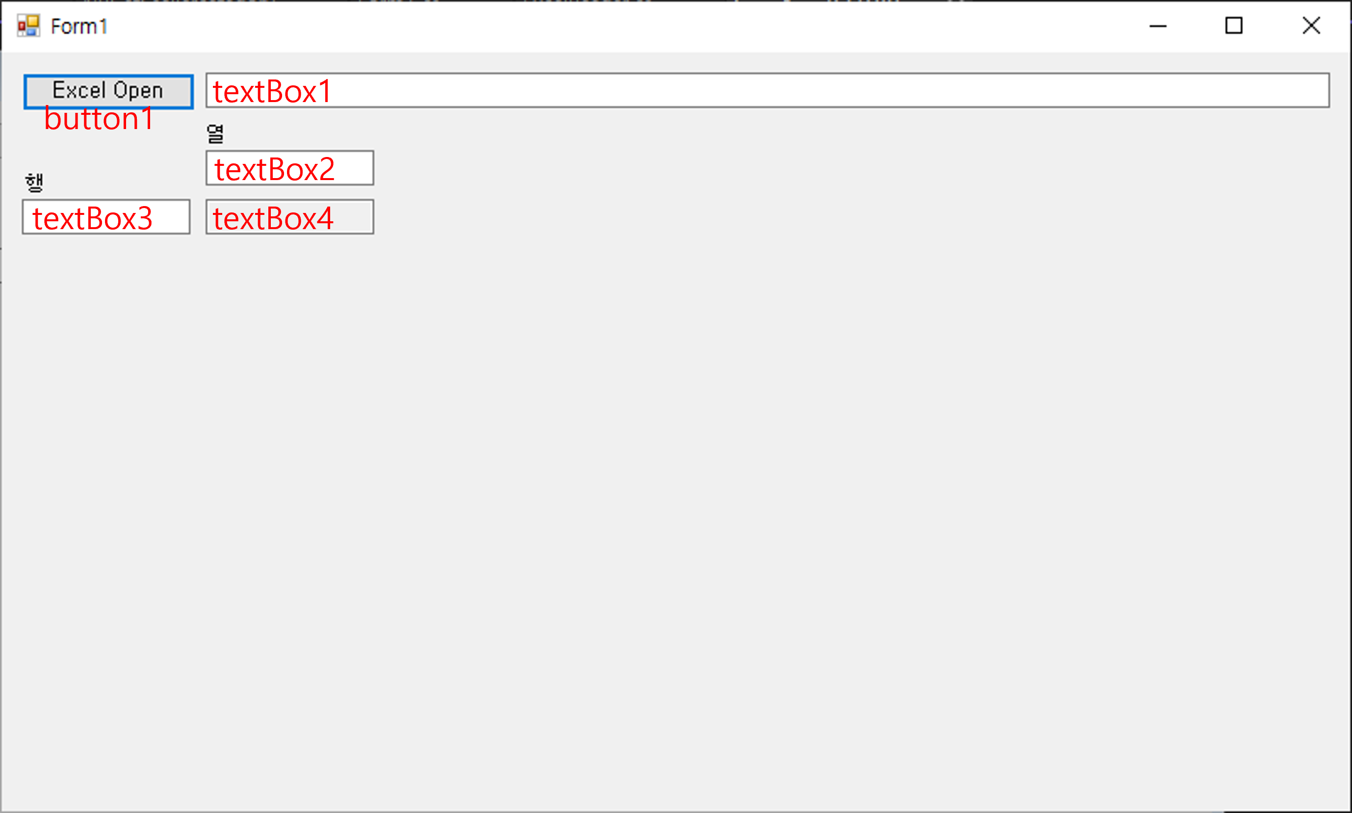 Windows Forms 애플리케이션에는 파일을 선택하는 OpenFileDialog, 셀의 값을 표시할 TextBox, 그리고 파일을 열고 셀 값을 읽는 Button을 포함합니다.