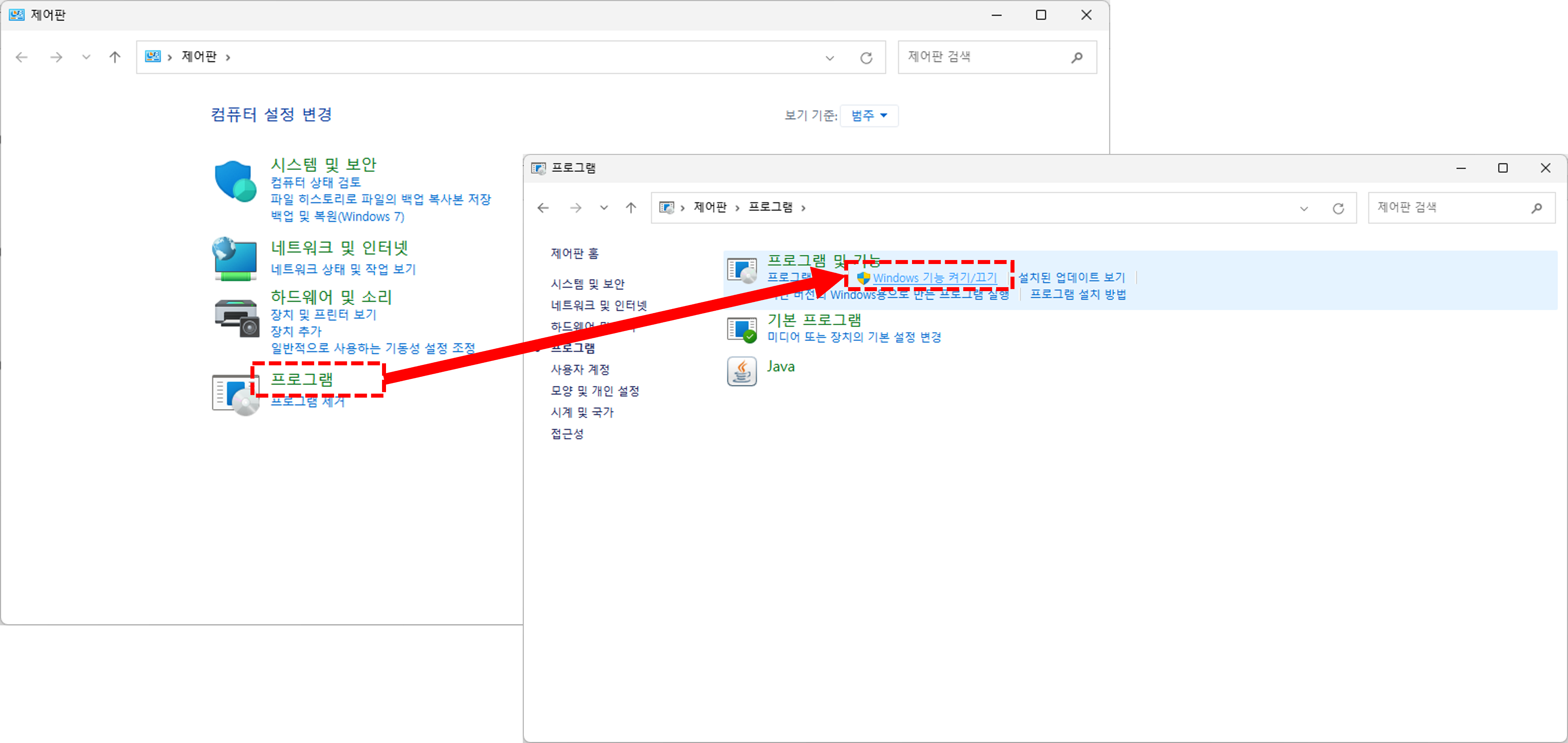 컨트롤 패널의 메뉴 중에서 "프로그램 및 기능"을 클릭하세요. 그리고는 "윈도우 기능 켜기/끄기"를 선택해 주십시오.