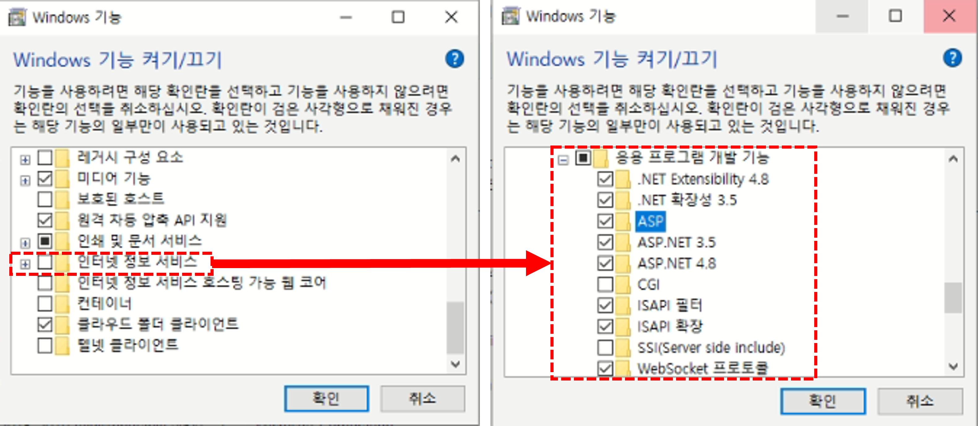 이제 "인터넷 정보 서비스" 혹은 "Internet Information Services"를 찾아 체크하세요. 그런 다음 '확인' 버튼을 누르면 IIS가 활성화됩니다. 이 때 응용프로그램 개발 기능에서 만약 asp나 .net으로 개발한 웹을 돌린다면, ASP, ASP.NET도 체크해서 활성화 해주세요.