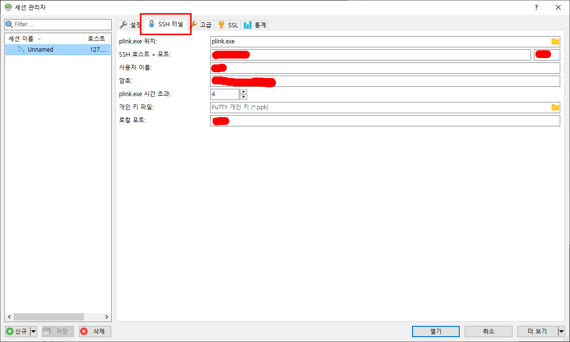 'SSH 터널' 탭에서 네이버 클라우드 플랫폼 서버의 SSH 접속 정보를 입력합니다.