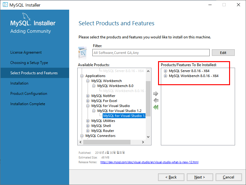 설치할 컴포넌트로 'MySQL Server'와 'MySQL Workbench'를 선택합니다. 이때, 원하는 버전을 선택할 수 있습니다.