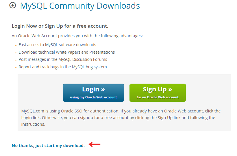 다운로드 페이지에서 로그인을 요구하면 페이지 하단의 'No thanks, just start my download.' 링크를 클릭하여 다운로드를 진행합니다.