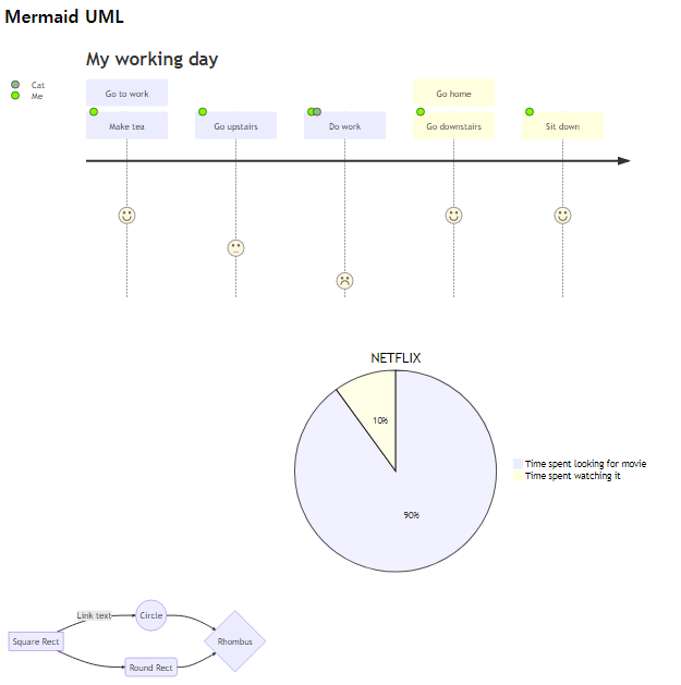 Mermaid를 사용하면 간단한 스크립트 코드만으로 웹 페이지에 다이어그램을 표현할 수 있다. 예를 들어, 위에서 제시한 코드를 통해 웹 페이지에 간단한 순서도와 파이 차트, 그래프를 표현할 수 있다.