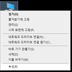 내PC에서 오른쪽마우스를 클릭해서 속성을 선택합니다.