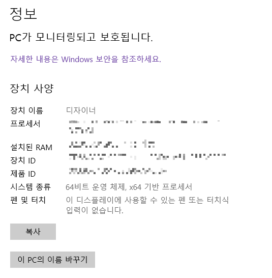 장치사양을 확인해보면 저의 장치이름은 `디자이너`로 되어있습니다.