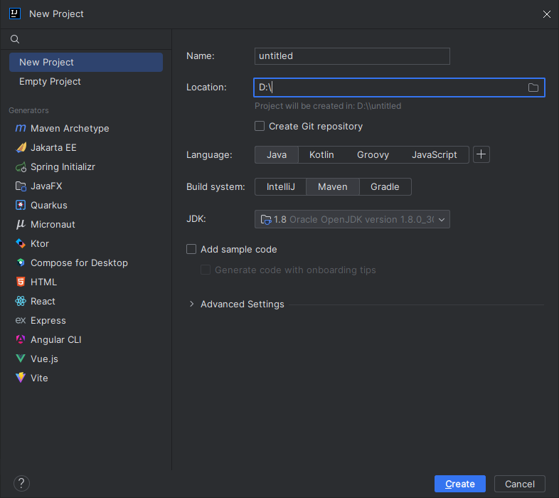 IntelliJ에서 새로운 Node.js 프로젝트를 생성하는 방법입니다.