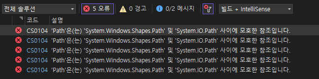 C# 혹은 wpf로 개발 중 'Path'이라는 이름이 'System.Windows.Shapes.Path' 및 'System.IO.Path' 네임스페이스에 모두 존재할 때, 컴파일러가 어떤 'Path'를 사용할지 결정하지 못해 모호한 참조 오류가 발생 합니다. 이 문제를 해결하기 위해서는 모호한 참조를 명확하게 지정해야 합니다. 전체 다 작성해주면 좋지만, 명시적으로 지정해준다면 더 간편하게 해결할 수 있답니다.