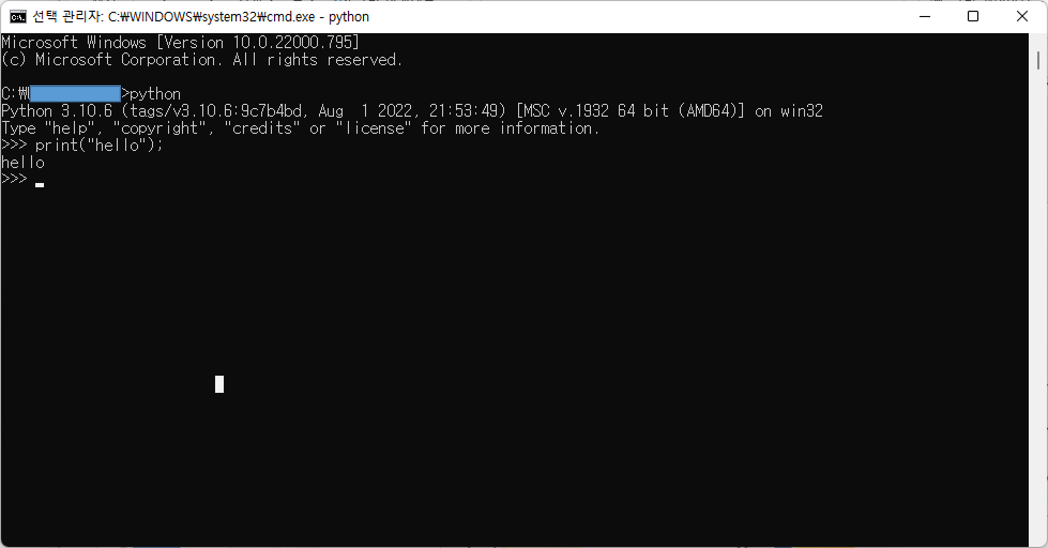 명령 프롬프트에서 파이썬 인터프리터가 실행 중인 상태에서 print("hello");를 입력하고 Enter 키를 누릅니다.